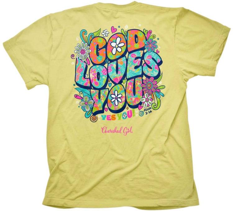 Show the world how much the Lord cares in this God Loves You T-shirt by Cherished Girl in Corn Silk. This charming retro design will draw attention to a message everyone longs to hear: Jesus loves you, yes you!