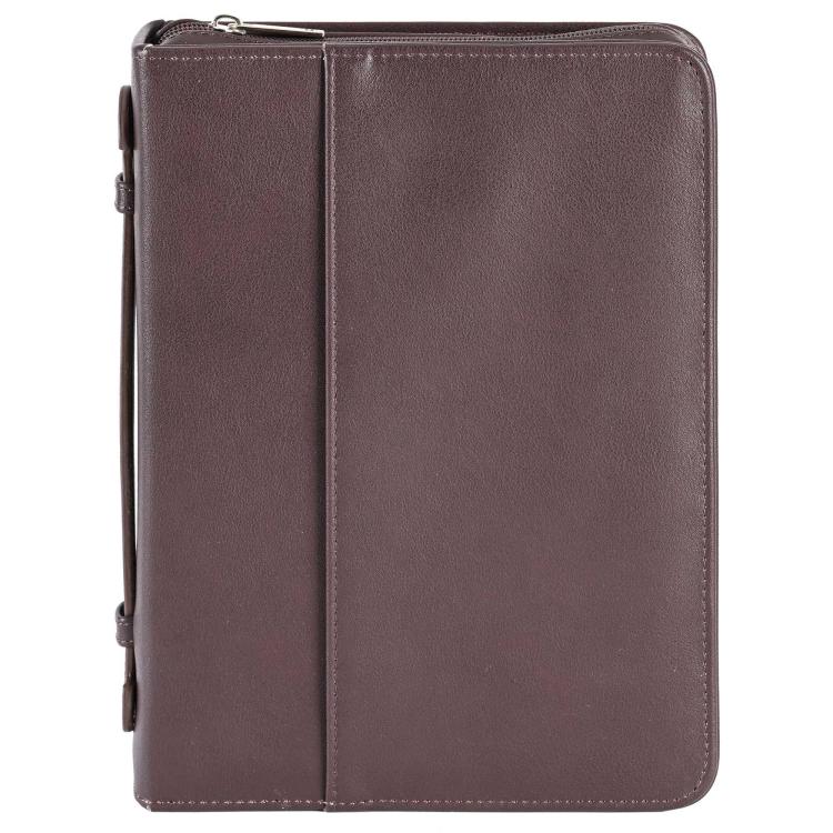 Hard Shell Style Polyurethane Bible Case. Solid Brown Color. Inside Is A Bookmark & Elastic Pen Loop With Cut Thru Cross Zipper Pull; Side Handle, Non-Rusting Self-Repairing Zipper, Nylon Reinforced Stitching, XX-Large Holds A Bible Or Book Up To 10-3/4 x 8-1/4 x 2.