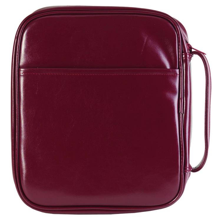 Great protection for the largest Bibles at a value price! Of soft leather-like vinyl, this Bible cover has a side carrying handle and rear open pocket, plus an attached elastic pen holder and ribbon bookmark inside. Inner dimensions are 11 inches x 9 inches x 2 3/4 inches.