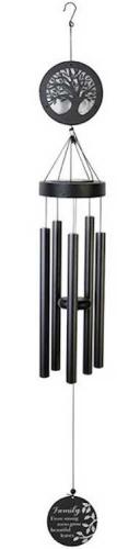 Contemporary windchime with solar disk topperChime is 45″ long with laser engraved disk design. LED solar light remains on for 8 hours with full charge