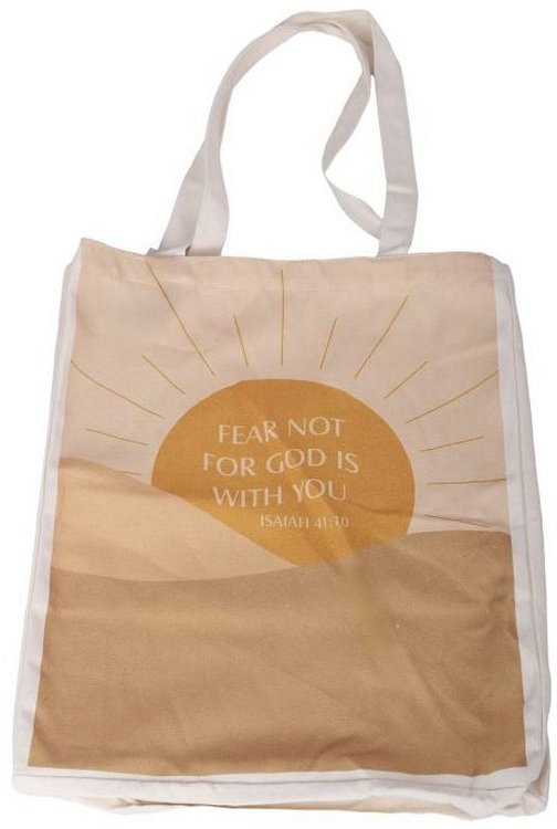 Carry encouragement wherever you go with this Christian tote bag. Designed in a soft cr me color, it is decorated with a calming, neutral-toned sun graphic. Across the front is the uplifting promise of Isaiah 41:10: Fear not, for God is with you. More than just a practical accessory, this tote is a bold reminder of God s strength and presence in everyday life.