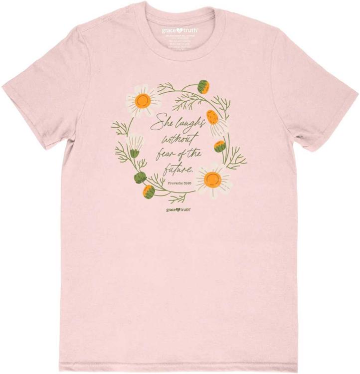 Let yourself laugh with joy in this sweet vintage-inspired Laugh Daisies T-shirt by grace & truth in Blush Pink. Let your heart be light as you place your trust fully in the Lord, leaning into His promises for today, and the hope He gives us for the future.