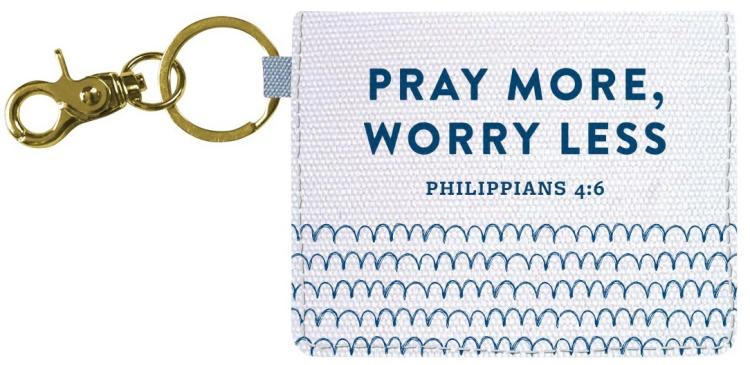 Remember to cast your cares upon Jesus when you carry this pretty + practical Pray More Worry Less Keychain ID Case in Blue/White by grace & truth . No problem, big or small, is beyond what God can handle on our behalf. This inspirational accessory is ideal for school, work, or travel! This handy case is able to hold your keys or attach to a lanyard or backpack, and the foldover snap design ensures your personal info stays protected and the contents securely in place.
