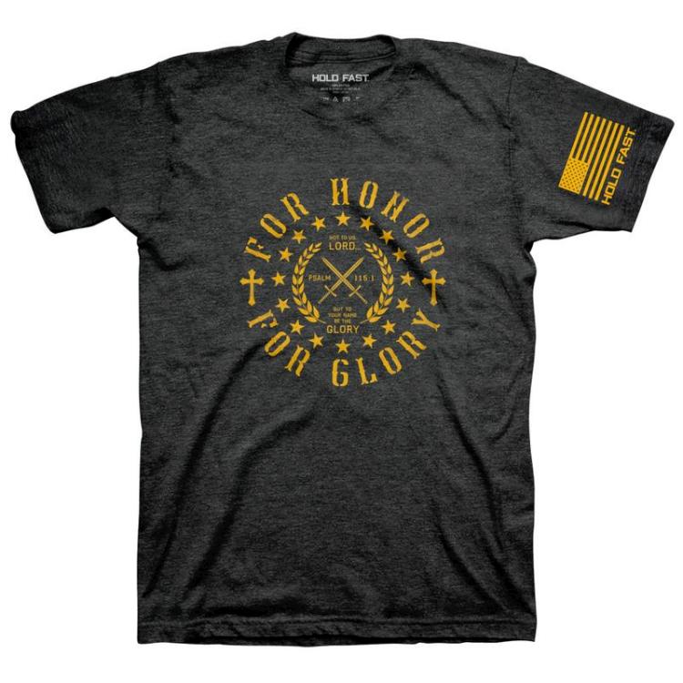 Honor and Glory, ah, proclaim them with this HOLD FAST Men s Christian T-shirt in Heather Dark Grey. The golden words will jump from your chest as you choose to be an ambassador for the God of all history, people, and nations. America has a great Heavenly Father!