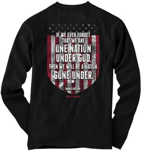 Share your faith in God in this powerful patriotic Gone Under HOLD FAST Long-Sleeve T-shirt in Black. We are a nation founded on the principle of freedom, including the freedom to pray, worship, and gather in Jesus name. Let us never forget to whom the credit goes for every blessing we enjoy as Americans, and as Christian believers.