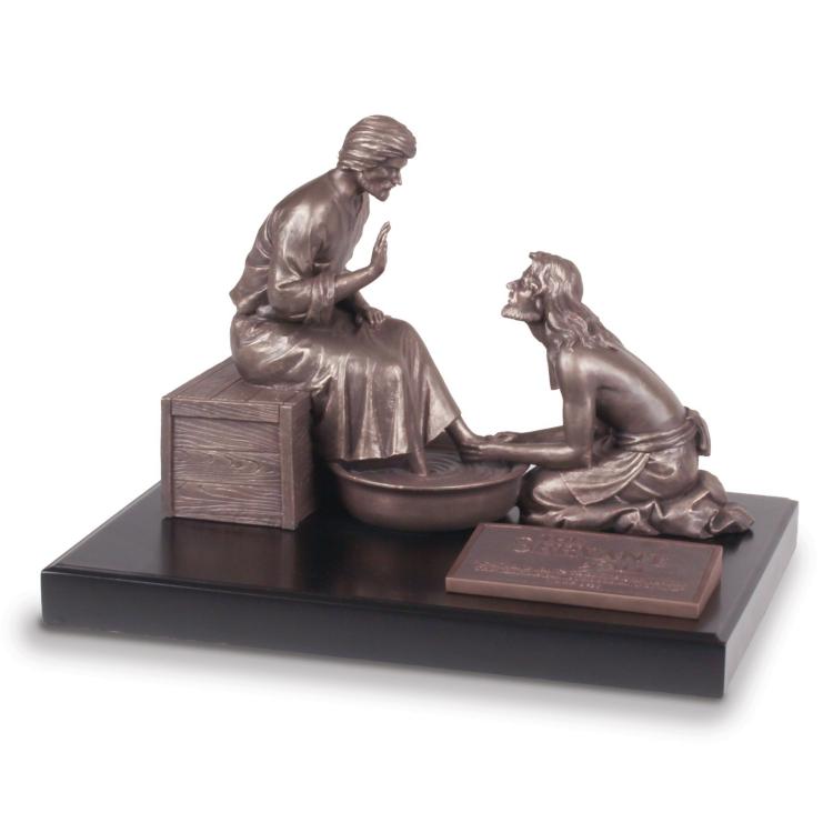 Extra large tabletop sculpture of the Humble Servant, Jesus Christ, washing the feet of one of his disciples. A visual representation of the lesson Jesus taught in John’s gospel 13.