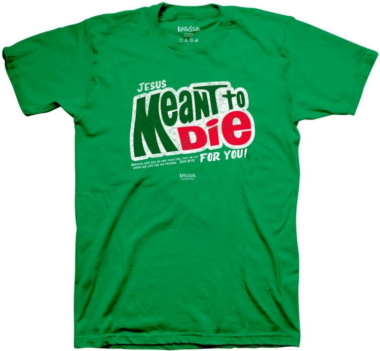 “Meant To Die Share the sweetest Good News in this Meant To Die Kerusso T-Shirt in Kelly Green. The incredible gift of salvation was no accident. God sent His only Son, Jesus Christ, to bear the burden of our sin on the cross at Calvary. His plan for us, and the incredible love it took to go through with it, is Good News indeed.
