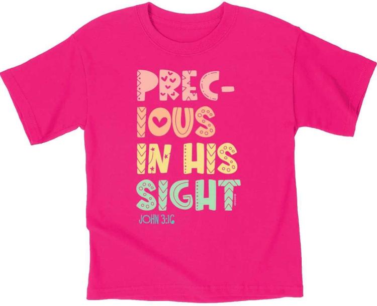 Remind her how much Jesus loves her in this sweet Precious In His Sight T-shirt by Kerusso Kidz in Heliconia. As you teach her how to read, remind her to brush her teeth, and model how to play well with others, tell her this vital truth: Jesus loves her dearly so much so that He was willing to give His life for her.