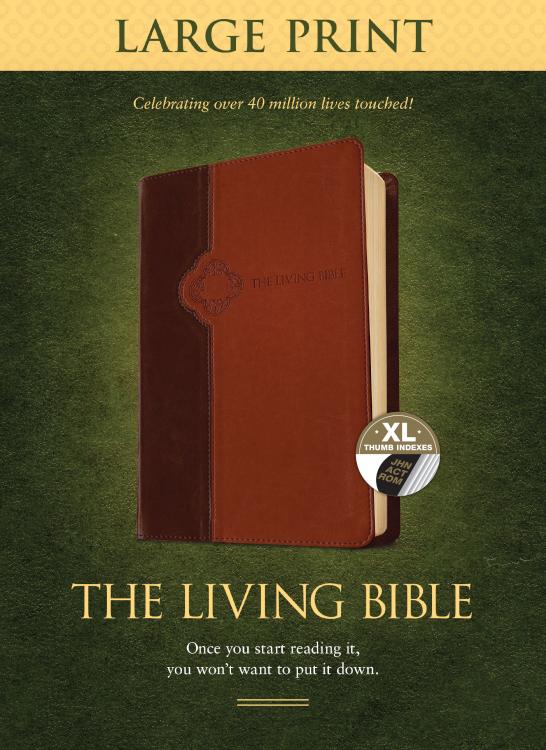 Celebrating over 40 years and over 40 million lives touched, Tyndale is releasing an indexed edition of the Large Print hardcover The Living Bible. Features include a Bible reading plan, four-color maps, topical concordance, presentation page, and large-print thumb tab indexing. The uncluttered, two-column format and large text make for easy reading.The Living Bible is a paraphrase of the Old and New Testaments. Its purpose is to say as exactly as possible what the writers of the Scriptures meant, and to say it simply, expanding where necessary for a clear understanding by the modern reader.