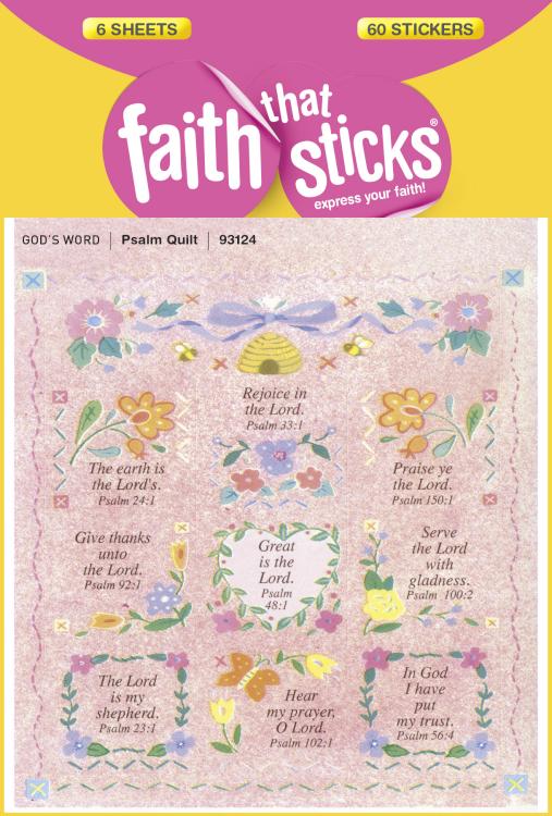 These stickers feature Bible verses from the Psalms on pink flowered squares and rectangles-reminiscent of an old fashioned quilt. Boys and girls will love laying them out in their own design as they read Scriptures like Great is the Lord, Give thanks unto the Lord, The earth is the Lord’s, and more. Six sheets, 10 stickers per sheet; 60 stickers per package.