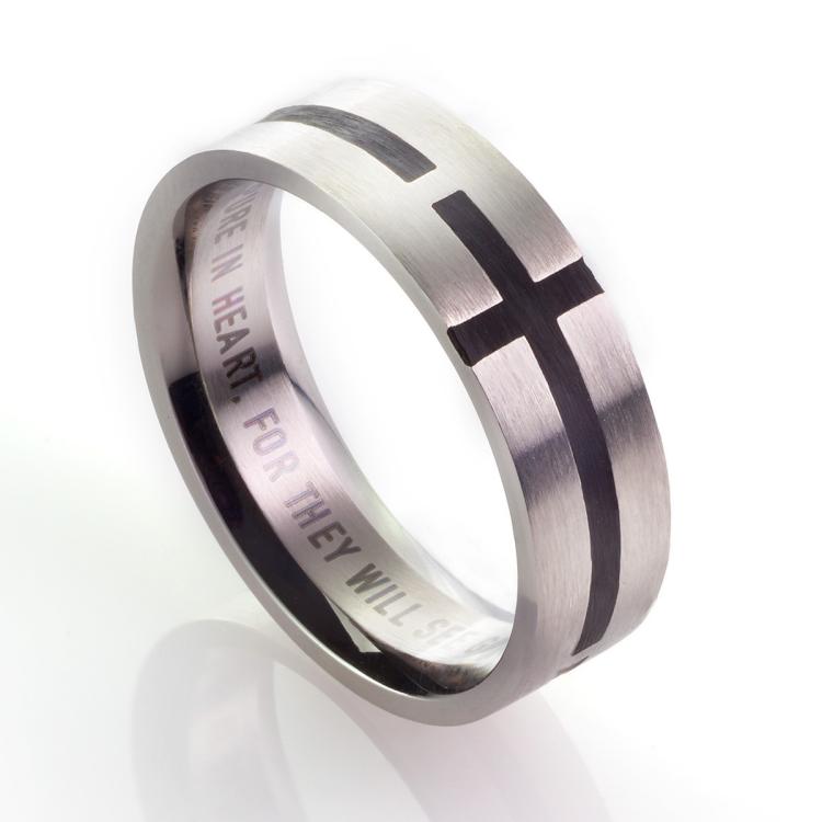 This exquisitely crafted men’s ring is a reminder of the blessing of those who are pure in heart as found in Matthew 5:8. This brushed silver stainless steel ring features a black contrasting cross extending down the center. Inside the band, you will find laser-engraved the entire verse from Matthew 5:8. The overall design gives this ring a stylish and sophisticated look.