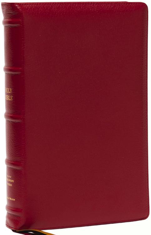 A beautifully constructed top of the line NKJV Bible with large print text and numerous end-of-page cross references allowing for an easy Bible reading experience.The Premier Collection of Thomas Nelson’s NKJV Large Print Thinline Reference Bible combines fine craftsmanship with the easy-to-carry thinline format. Typeset in Thomas Nelson’s NKJV Comfort Print(R) for a smooth reading experience, this Bible allows readers to enjoy the accurate and beautiful New King James Version in a volume designed to last. Featuring a supple goatskin leather cover, durable edge-lined binding, premium European Bible paper, beautiful art gilded edges, and three ribbon markers, this special edition is a treasure for a lifetime in God’s Word.Features include:Line-matched classic 2-column formatExtensive end-of-page cross references allow you to find related passages quickly and easilyPresentation page to personalize this special gift by recording a memory or a noteBlack letter text throughoutPremium European Bible paper, 36 gsm for limited bleedConcordance for looking up a word’s occurrences throughout the BibleFull color maps show a visual representation of Israel and other biblical locations for better contextThree satin ribbon markers, each 3/8-inch wide for you to easily navigate and keep track of where you are readingArt gilding on page edges: red stain under goldGenerous yapp serves to protect the high-end gildingGilt line stamped and perimeter stitchingSmyth-sewn and edge-lined construction to lay open with easeEasy-to-read 10-point NKJV Comfort Print