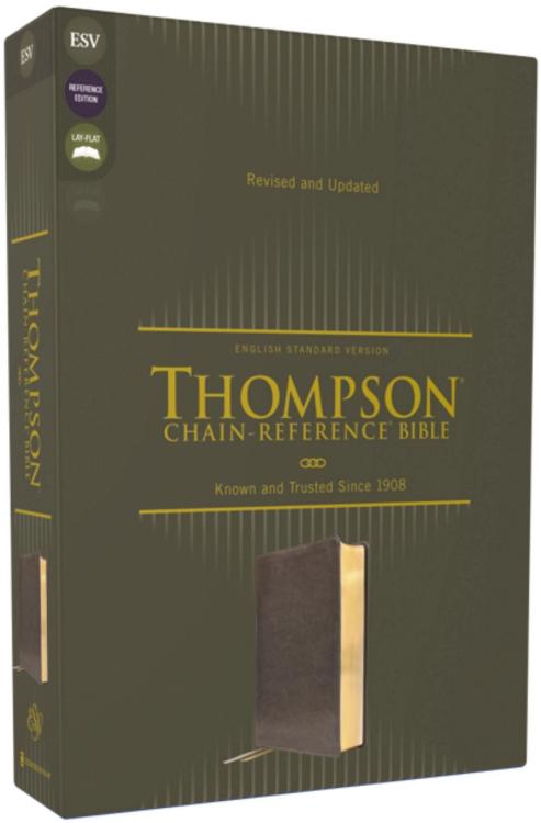 An easy-to-learn, easy-to-use tool for in-depth Bible studyBeloved and acclaimed for more than five generations, the Thompson(R) Chain-Reference(R) Bible is unparalleled in its ability to enrich personal devotions, topical study, and sermon preparation. This unique reference Bible enables you to search the breadth of Scripture’s teachings on thousands of topics and allows you to follow those topics throughout the entire Bible. With over 100,000 references, covering over 8,000 topics, the chain-reference system is an ideal tool for comprehensive topical study. The Thompson Chain-Reference Bible also offers a library of additional study resources that allows readers to interpret the Bible using related scripture passages rather than consulting a commentary.The ESV Thompson Chain-Reference Bible also features a fresh, two-color design that preserves the original look of the chain-reference system, while making each page cleaner and easier to read. Features:Complete text of the English Standard Version (ESV)Easy-to-understand chain-reference system with over 100,000 referencesAlphabetical and numerical indexes highlight study materials for over 8,000 topics, each with its own topic number, for exhaustive topical studyAn extensive study resource section includes biographical sketches, illustrated studies of the Bible, a concordance, Bible harmonies, and many other helpful study toolsFresh, two-color page design66 book introductions16-page full-color map section with map indexLine-matched text for enhanced readabilityWords of Jesus in redPresentation page for gift-givingGilded page edgesTwo double-sided satin ribbon markers, each 3/8-inch wideLeathersoft cover lies flat when openReadable Lexicon typeface9.5-point type size