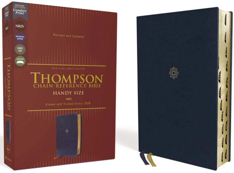 An easy-to-learn, easy-to-use tool for in-depth Bible studyBeloved and acclaimed for more than five generations, the Thompson(R) Chain-Reference(R) Bible is unparalleled in its ability to enrich personal devotions, topical study, and sermon preparation. This unique reference Bible enables you to search the breadth of Scripture’s teachings on thousands of topics and allows you to follow those topics throughout the entire Bible. With over 100,000 references, covering over 8,000 topics, the chain-reference system is an ideal tool for comprehensive topical study. The Thompson Chain-Reference Bible also offers a library of additional study resources that allows readers to interpret the Bible using related scripture passages rather than consulting a commentary.The NKJV Thompson Chain-Reference Bible, Handy Size is printed in the NKJV Comfort Print(R) typeface for easy reading. Expertly designed specifically to be used for the New King James Version (NKJV) text, Comfort Print offers an easier reading experience that complements the translation. This Bible also features a fresh, two-color design that preserves the original look of the chain-reference system, while making each page cleaner and easier to read.Features:Complete text of the New King James Version (NKJV)Easy-to-understand chain-reference system with over 100,000 referencesAlphabetical and numerical indexes highlight study materials for over 8,000 topics, each with its own topic number, for exhaustive topical studyAn extensive study resource section includes biographical sketches, illustrated studies of the Bible, a concordance, Bible harmonies, and many other helpful study toolsFresh, two-color page design66 book introductions16-page full-color map section with map indexLine-matched text for enhanced readabilityWords of Jesus in redPresentation page for gift-givingPersonal size for easy carryingGilded page edgesTwo double-sided satin ribbon markers, each 3/8-inch wideLeathersoft cover lies flat when openThumb indexed to make finding the books of the Bible easierExclusive NKJV Comfort Print typefacePrint size: 8