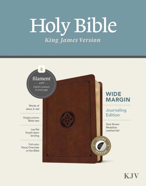 Tyndale’s KJV Wide Margin Bible, Filament Enabled Edition is a fresh presentation of a classic translation. It features readable text in the revered King James Version, an attractive single-column layout, and 2.25″ lightly ruled margins, making this Bible great for note-taking, journaling, recording prayers, doodling, drawing, or any other creative expression in response to God’s Word. Special features include quality white Bible paper for journaling, durable lay-flat Smyth-sewn binding, and a matching ribbon marker.Tyndale Wide Margin Bibles are the only journaling Bibles with access to the Filament Bible app, which features thousands of study notes, devotionals, videos, reading plans, and more! The Filament Bible app turns this Bible into a powerful study and devotional experience, offering more to expand your mind and touch your heart than you can possibly hold in your hand.