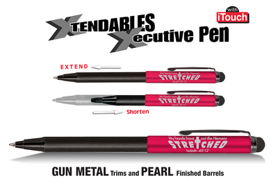 3 great new designs of our telescoping ball point pen with gun metal trims and assorted pearl finished barrels. Xtends for comfortable writing / retracts compactly to store.